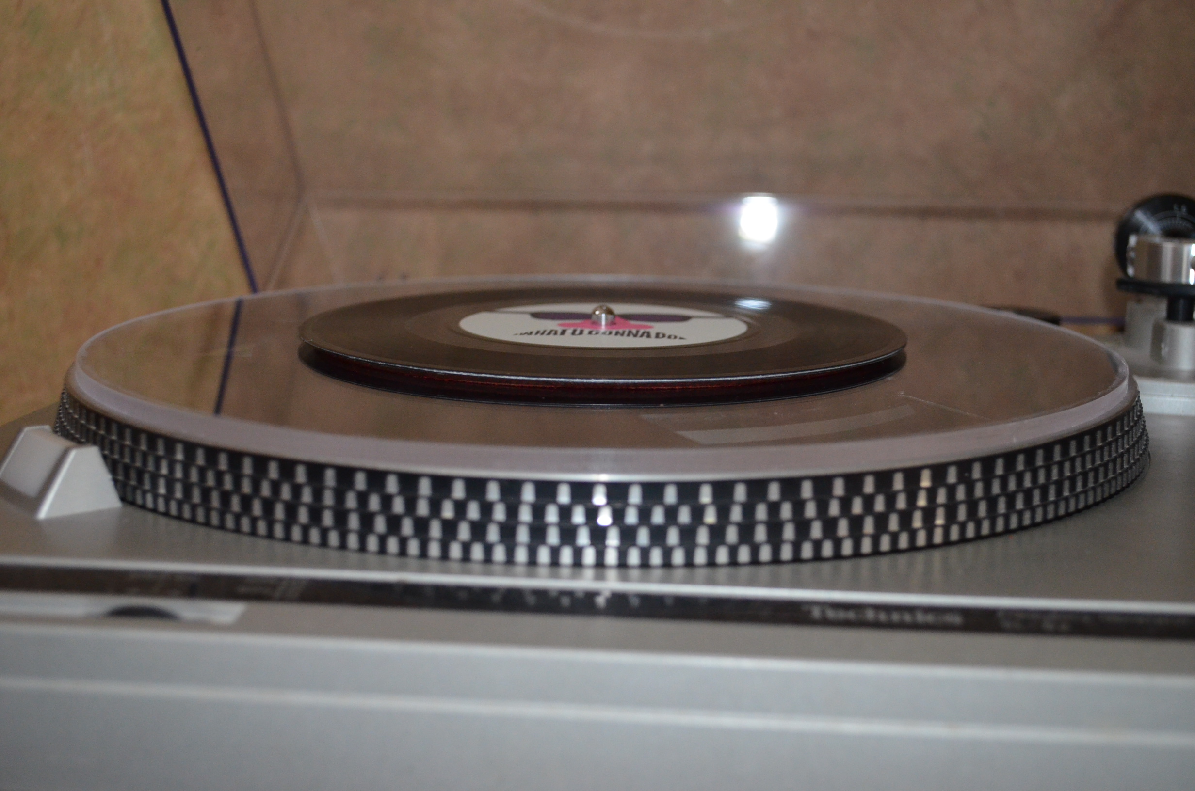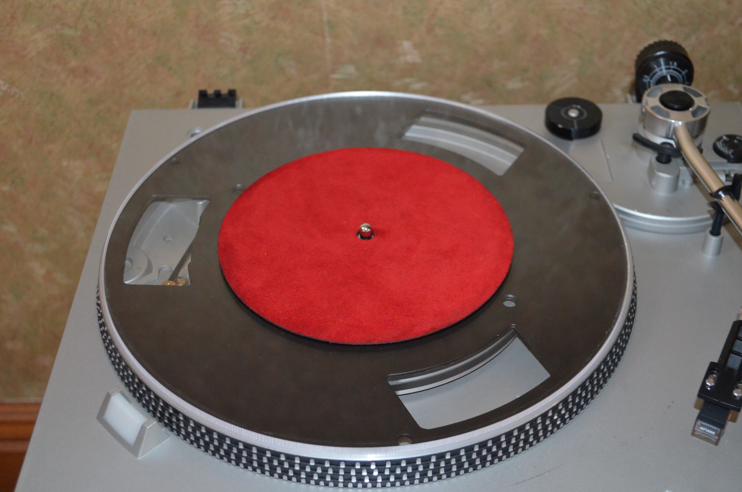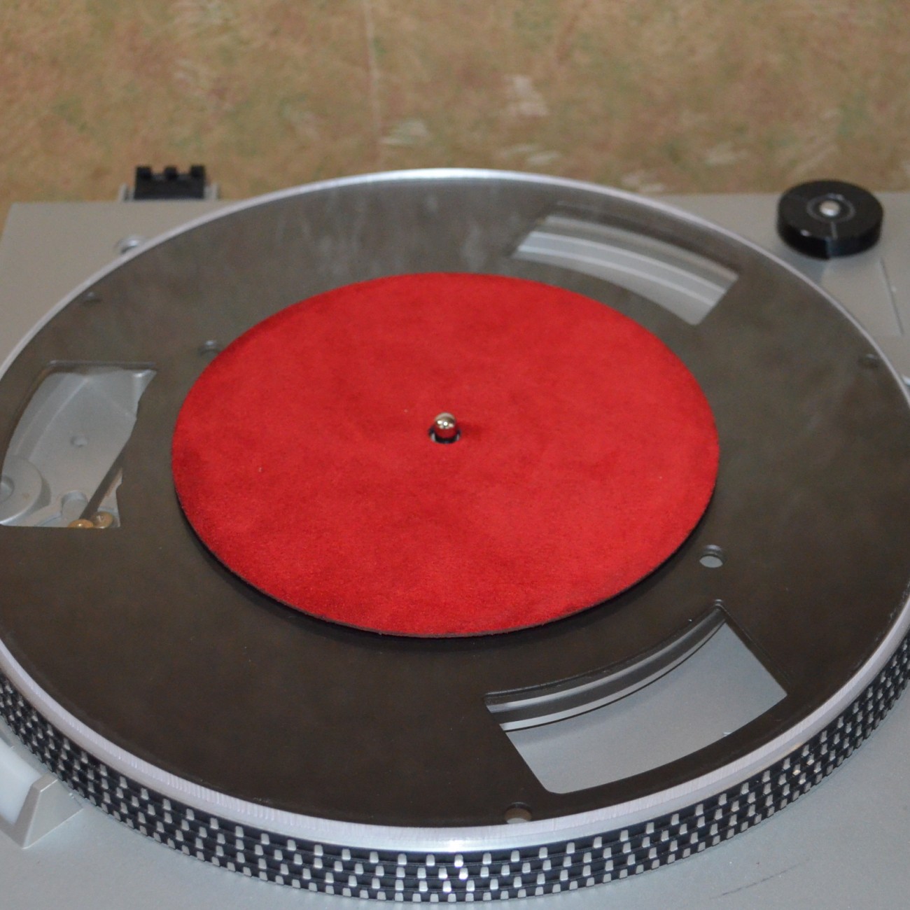This bright red leather mat has two, identical suede sides. I generally remove my 11.5″ mat from my acrylic platter and place the 6.5″ mat down when I want to play through several of my 45s. If you have a dedicated turntable for 45s, this mat would be ideal. The main reason I developed this mat was because I found it difficult to get a grip on the edge of the 45 to lift if off the 11.5″ leather mat. With the 6.5″ mat, you will have a slight overhang, as with the 11.5″ platter mats, for easy removal of the record. The center hole is 3/8″, fitting all spindles.